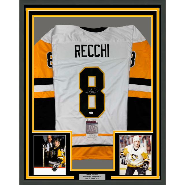 Framed Autographed/Signed Mark Recchi 35x39 Pittsburgh White Hockey Jersey JSA COA is backordered and will ship as soon as it is back in stock.