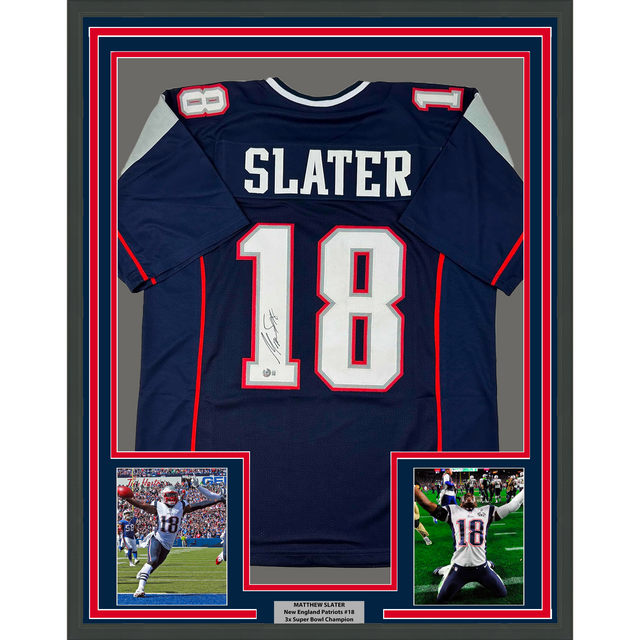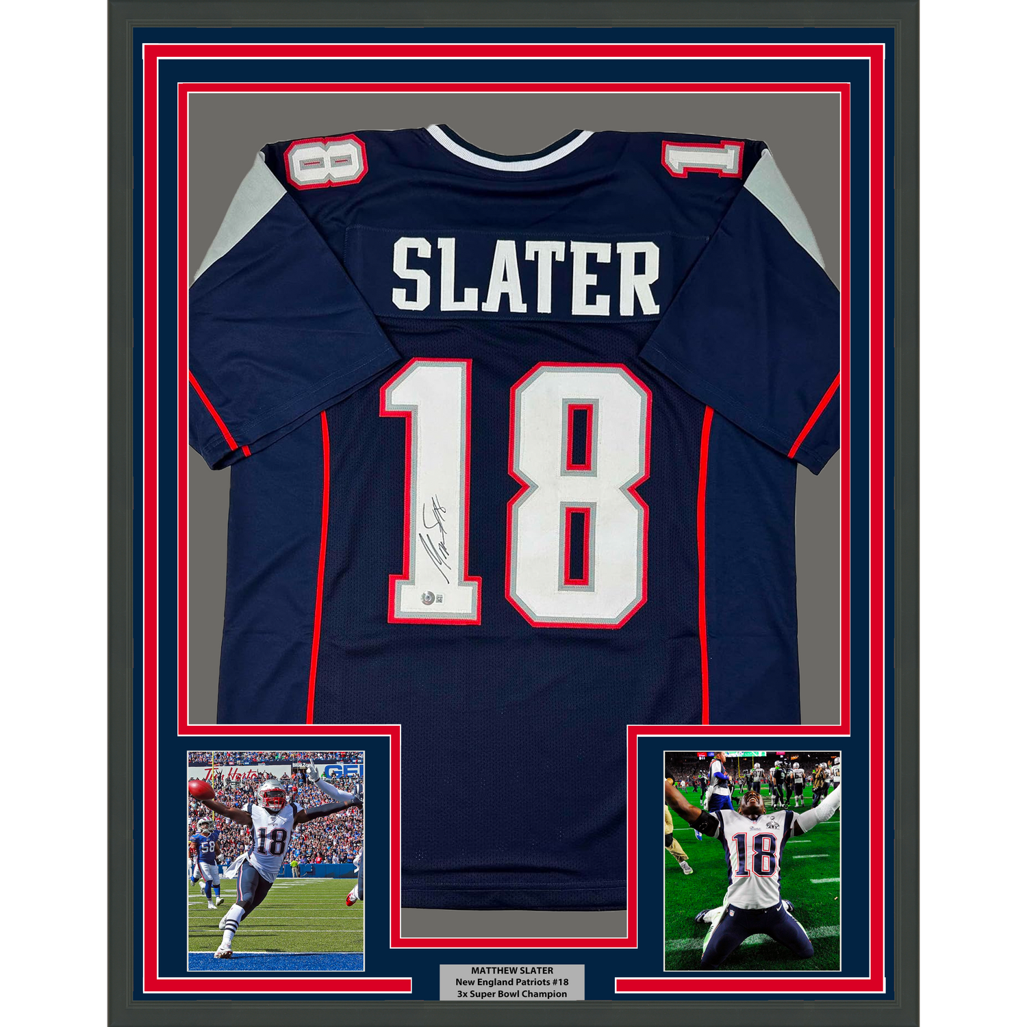 Framed Autographed/Signed Matthew Slater 35x39 New England Blue Football Jersey Beckett BAS COA is backordered and will ship as soon as it is back in stock.