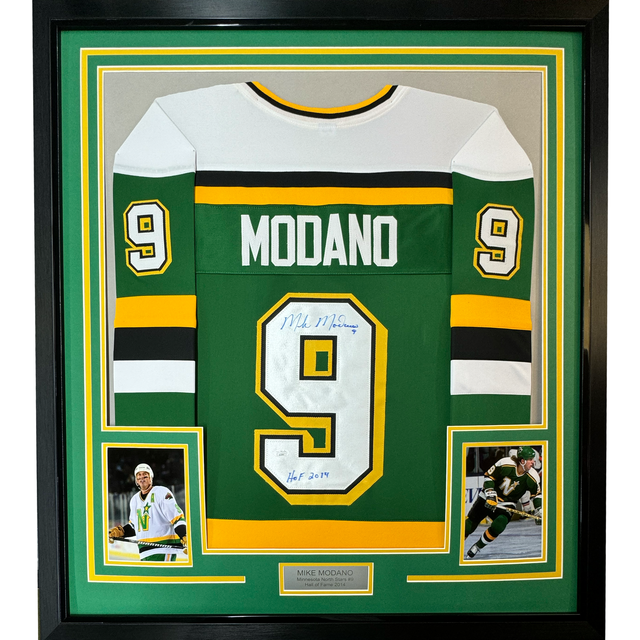 Framed Autographed/Signed Mike Modano HOF 2014 35x39 Minnesota Green Hockey Jersey Beckett BAS COA
