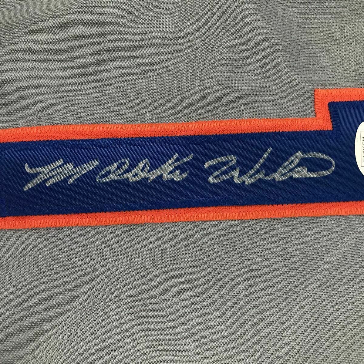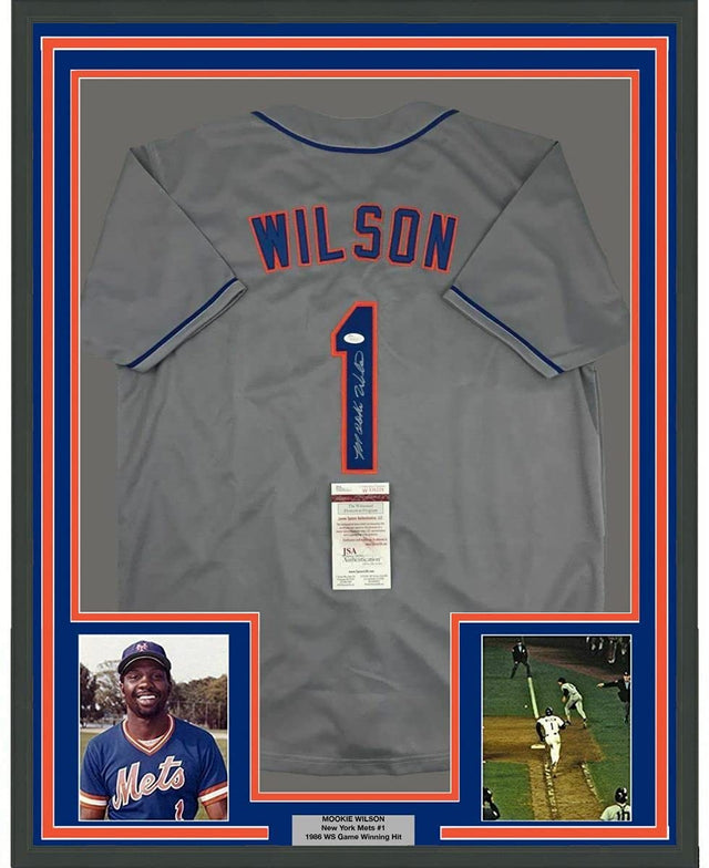 Framed Autographed/Signed Mookie Wilson 35x39 New York Grey Baseball Jersey JSA COA