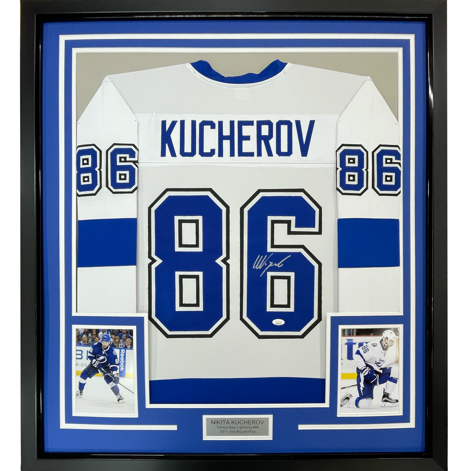 Framed Autographed/Signed Nikita Kucherov 35x39 Tampa Bay White Hockey Jersey PSA/DNA COA