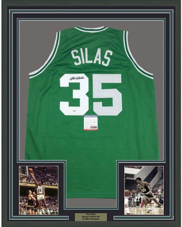 Framed Autographed/Signed Paul Silas 35x39 Boston Green Basketball Jersey PSA/DNA COA