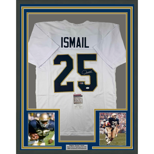 Framed Autographed/Signed Raghib Ismail Rocket 35x39 Notre Dame White College Football Jersey JSA COA
