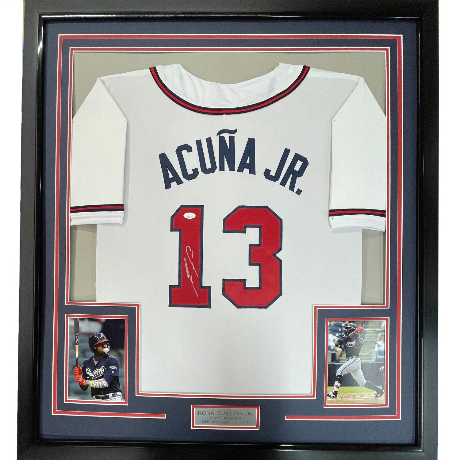 Framed Autographed/Signed Ronald Acuna Jr. 35x39 Atlanta White Baseball Jersey JSA COA