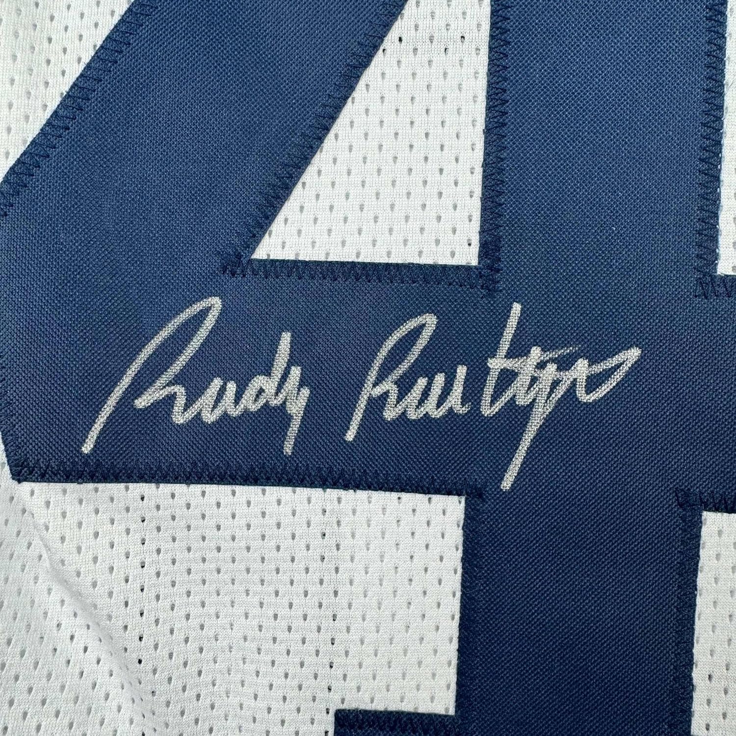 Framed Autographed/Signed Rudy Ruettiger 35x39 Notre Dame White College Football Jersey JSA COA