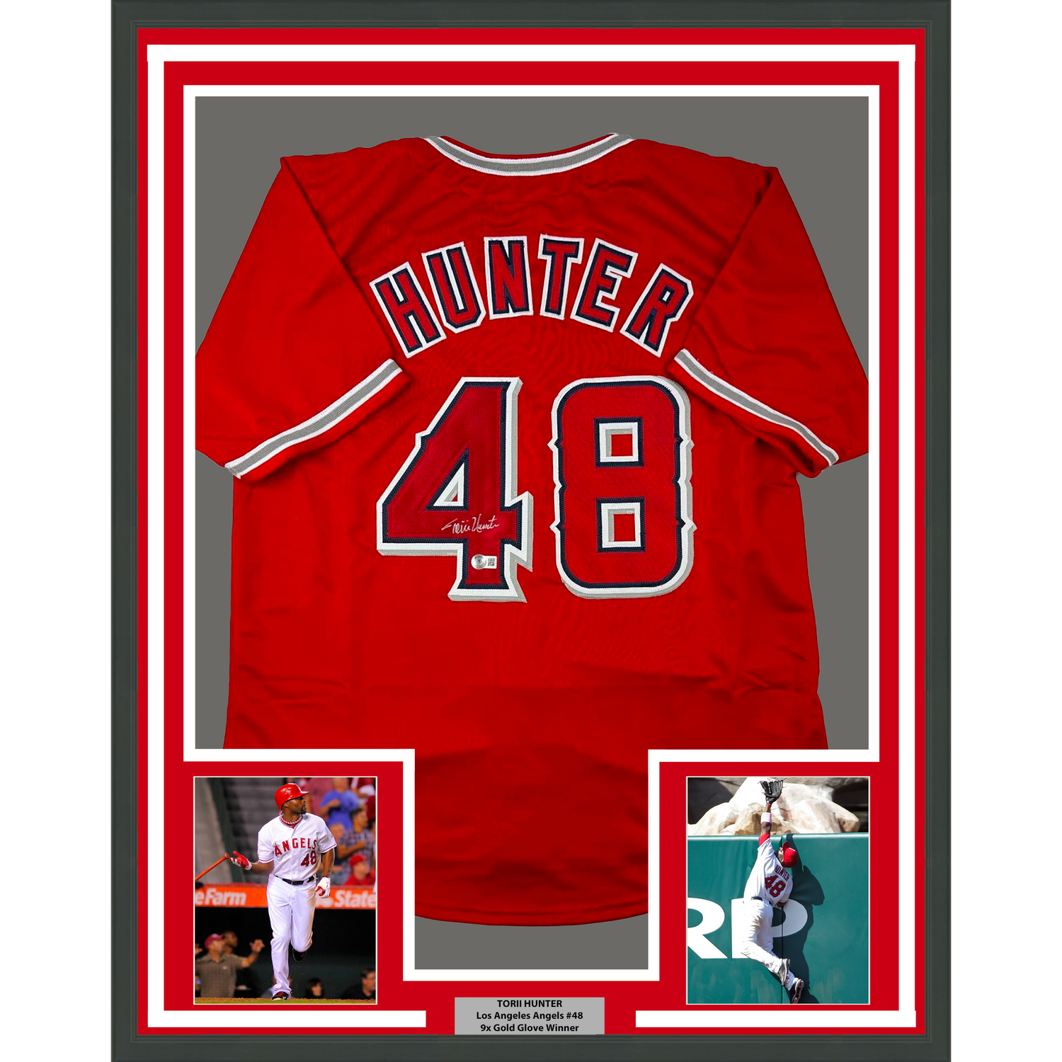 Framed Autographed/Signed Torii Hunter 35x39 Los Angeles Anaheim Red Baseball Jersey Beckett BAS COA