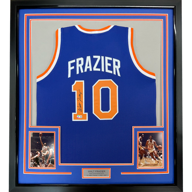 Framed Autographed/Signed Walt Frazier 35x39 New York Blue Basketball Jersey PSA/DNA COA