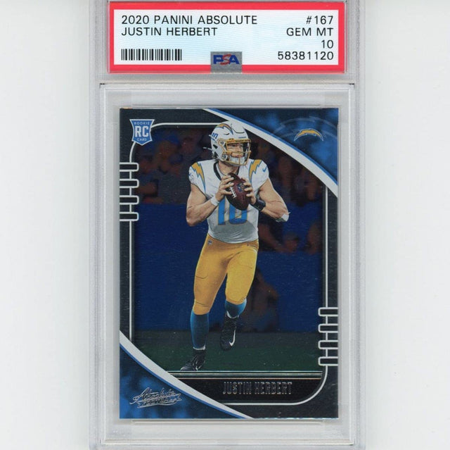 Graded 2020 Panini Absolute Justin Herbert #167 Rookie RC Football Card PSA 10 Gem Mint is backordered and will ship as soon as it is back in stock.