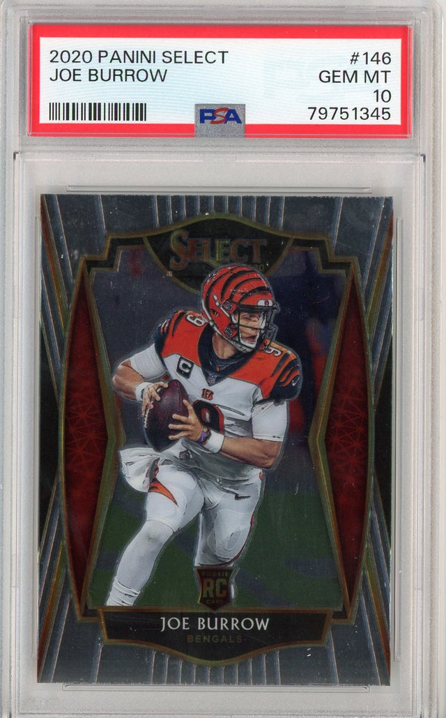 Graded 2020 Panini Select Joe Burrow #146 Rookie RC Football Card PSA 10 Gem Mint is backordered and will ship as soon as it is back in stock.