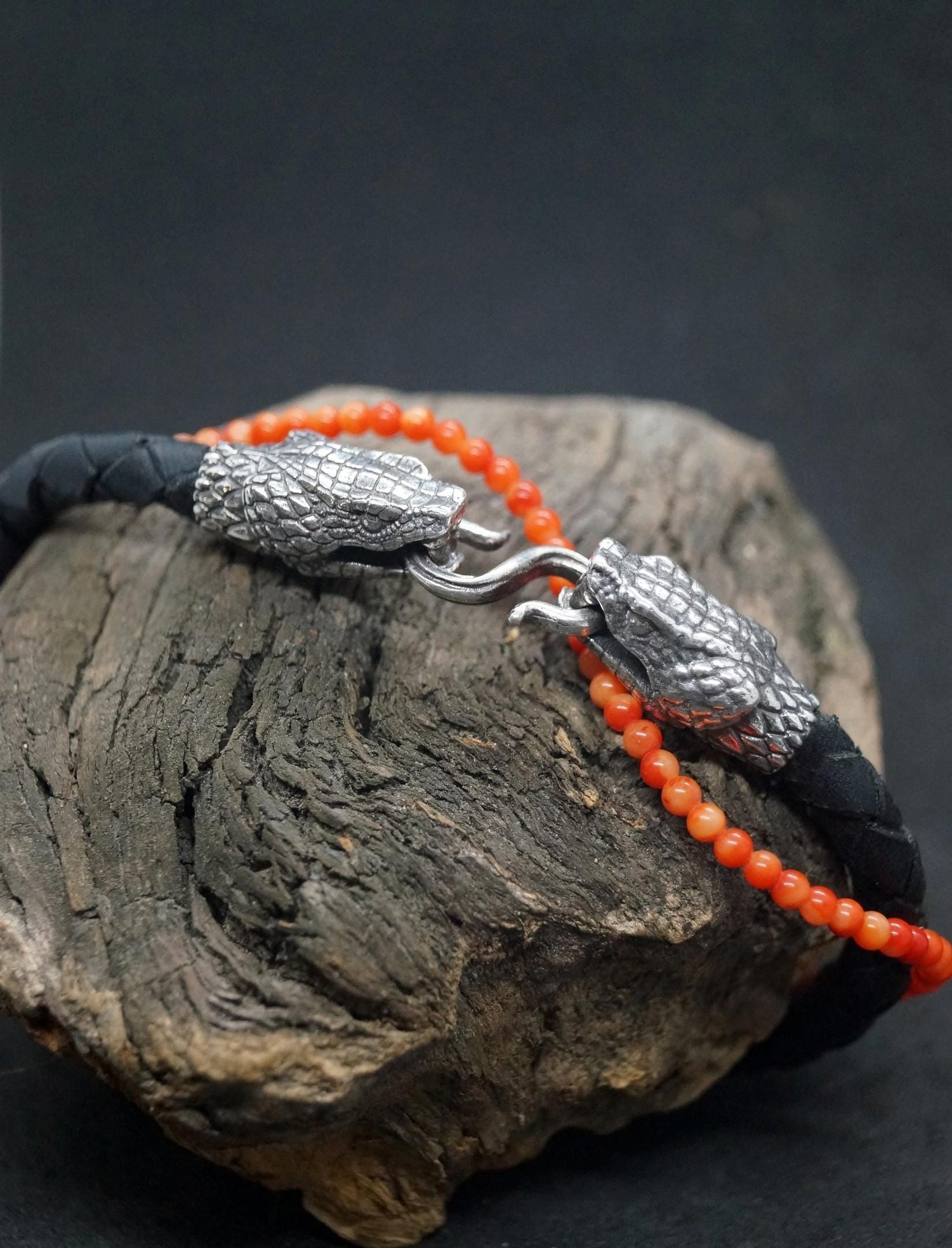 Leather Black Braided Bracelet with Silver Snake‘s Heads Bracelet Anniversary Gift, Realistic Wolf Leather Bracelet, Wolf lovers gift
