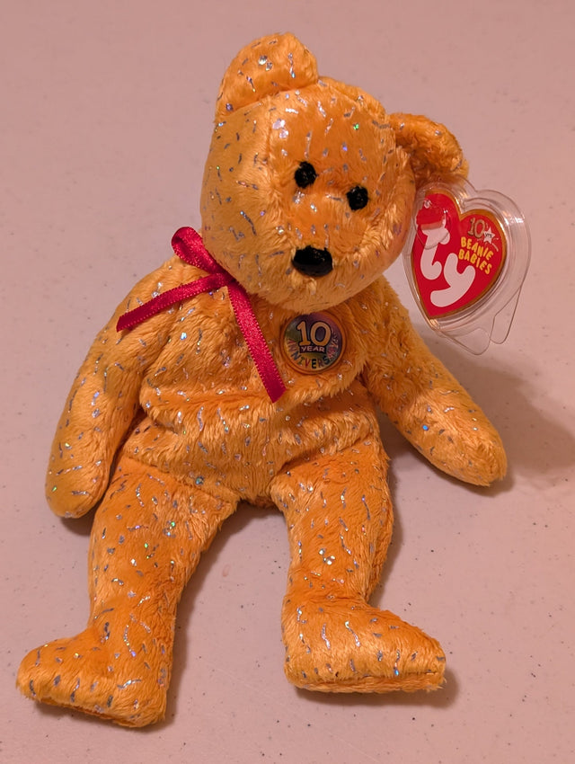 10th Anniversary Topaz the Bear - Ty Beanie Baby (Gold, 2003, Plush Toy, Stuffed Animal, MWMT, Vintage, Retired)