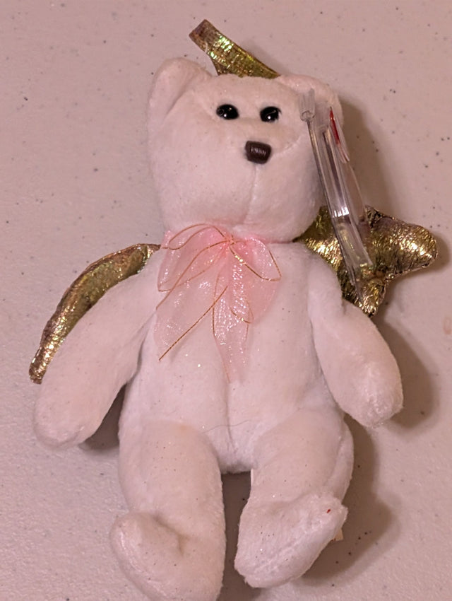 Angel the Bear - Ty Jingle Beanie Baby (White, Gold, Pink, 2000, Plush Toy, Stuffed Animal, MWMT, Vintage, Retired)