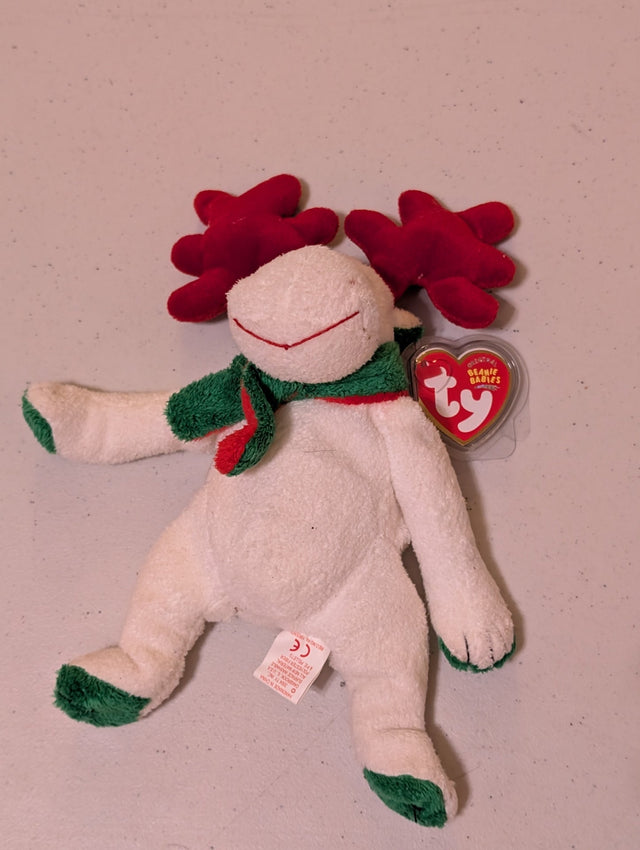 Twigs the Reindeer - Ty Beanie Baby (White, Green, Red, 1995, MWMT, Plush, Toy, Stuffed Animal, Vintage, Retired)