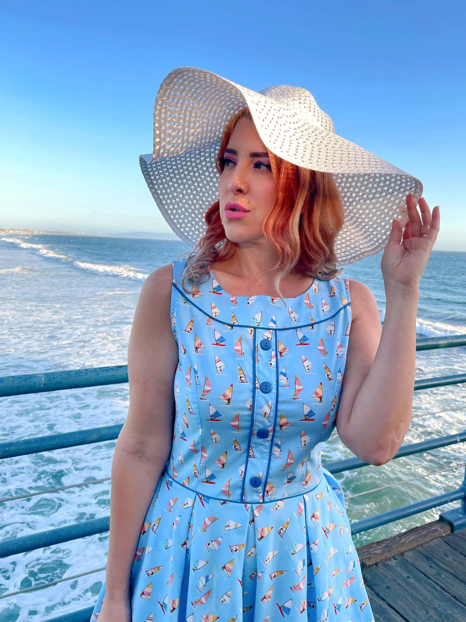 Looking for a classic vintage style dress?  Our Elizabeth cut with all its details is everything you could want and more!  Shown in our fun windsurfer print, this cotton dress features piping details throughout the bodice with front non-functional buttons, waist with figure flattering pleats, a vintage inspired twirl-worthy skirt with hidden side pockets, and a back zippered closure.