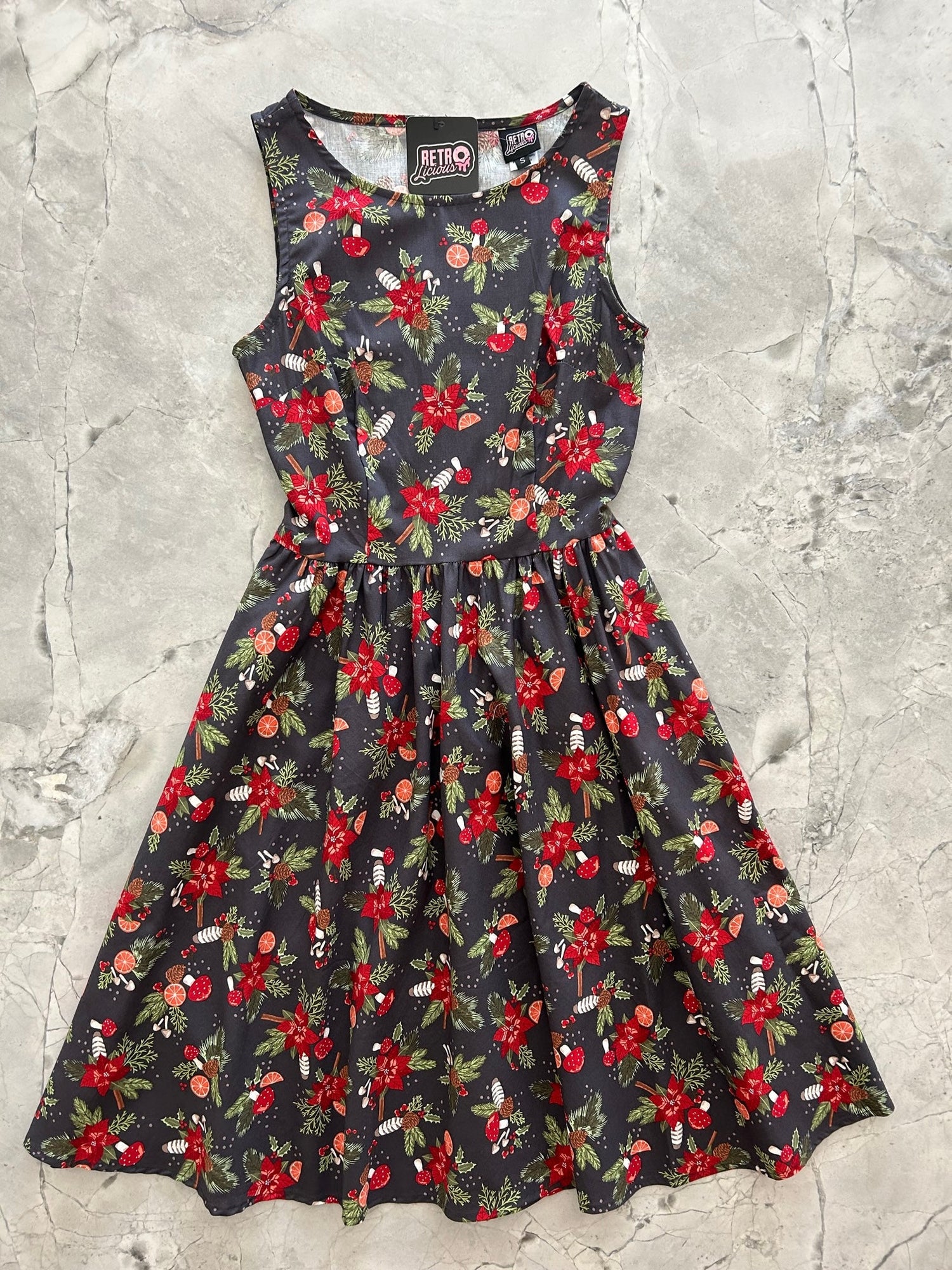 Introducing our Festive Vintage Dress. This enchanting dress features a delightful pattern of mushrooms, poinsettias, and orange slices, creating a whimsical and fun design that's perfect for the holiday season. With a vintage-inspired silhouette, it's the ideal choice for adding a touch of retro charm to your celebrations. Step into the season with this unique and eye-catching piece!