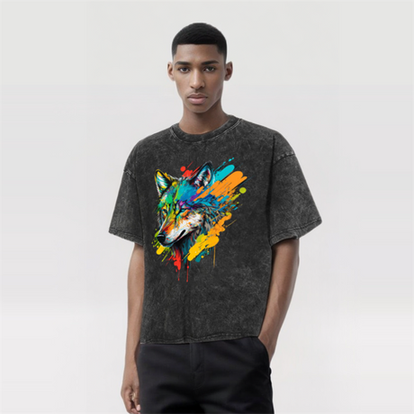 Vintage Washed Colorful Wolf Head Print T-shirt