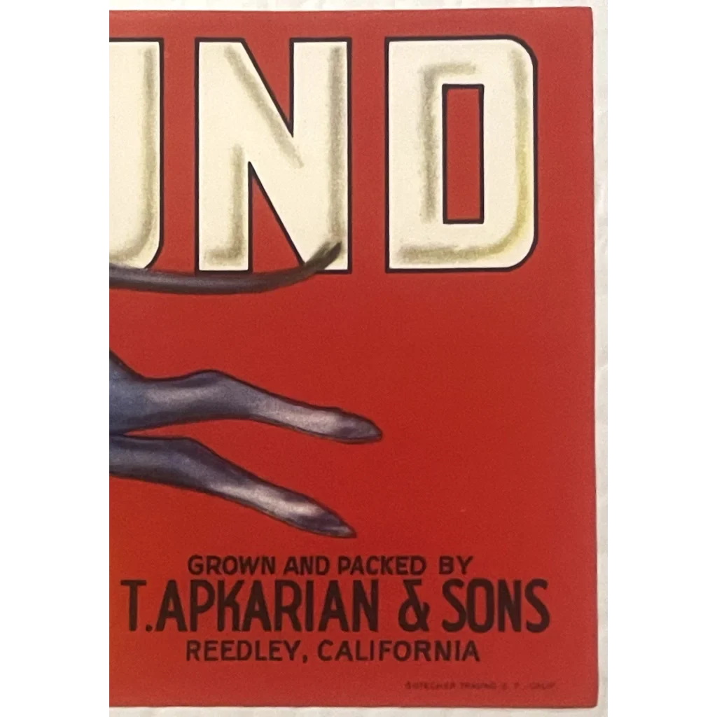 Antique Vintage 1950s Blue Hound Crate Label from Reedley CA
