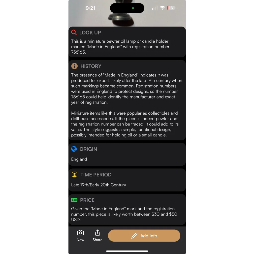 The AI Scan of this fascinating item delivers a comprehensive full description that's absolutely mind-blowing! I'm picking up knowledge at lightning speed, but these specialized antique pieces are way beyond my usual expertise, so I'm putting complete trust in the AI technology - and wow, has it proven to be remarkably precise in its analysis.