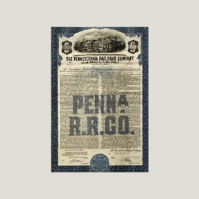 Imagine the thrill of displaying this vintage historic collectible on your wall! As a striking piece of home decor, this Pennsylvania Railroad Pennsy Gold Bond certificate will captivate visitors in any room. Stock and bond certificates like this are in limited supply, and their scarcity only increases as they become part of museums and private collections. They're not just historical documents; they're potential future investments with a rich legacy. From the first stock certificate issued by the Dutch East India Company in 1606 to one of the last paper stock certificates from a major corporation issued by Walt Disney Company in 2013, these documents span over four centuries of financial history. Who knows what future value this rare Pennsy Gold Bond piece might hold?