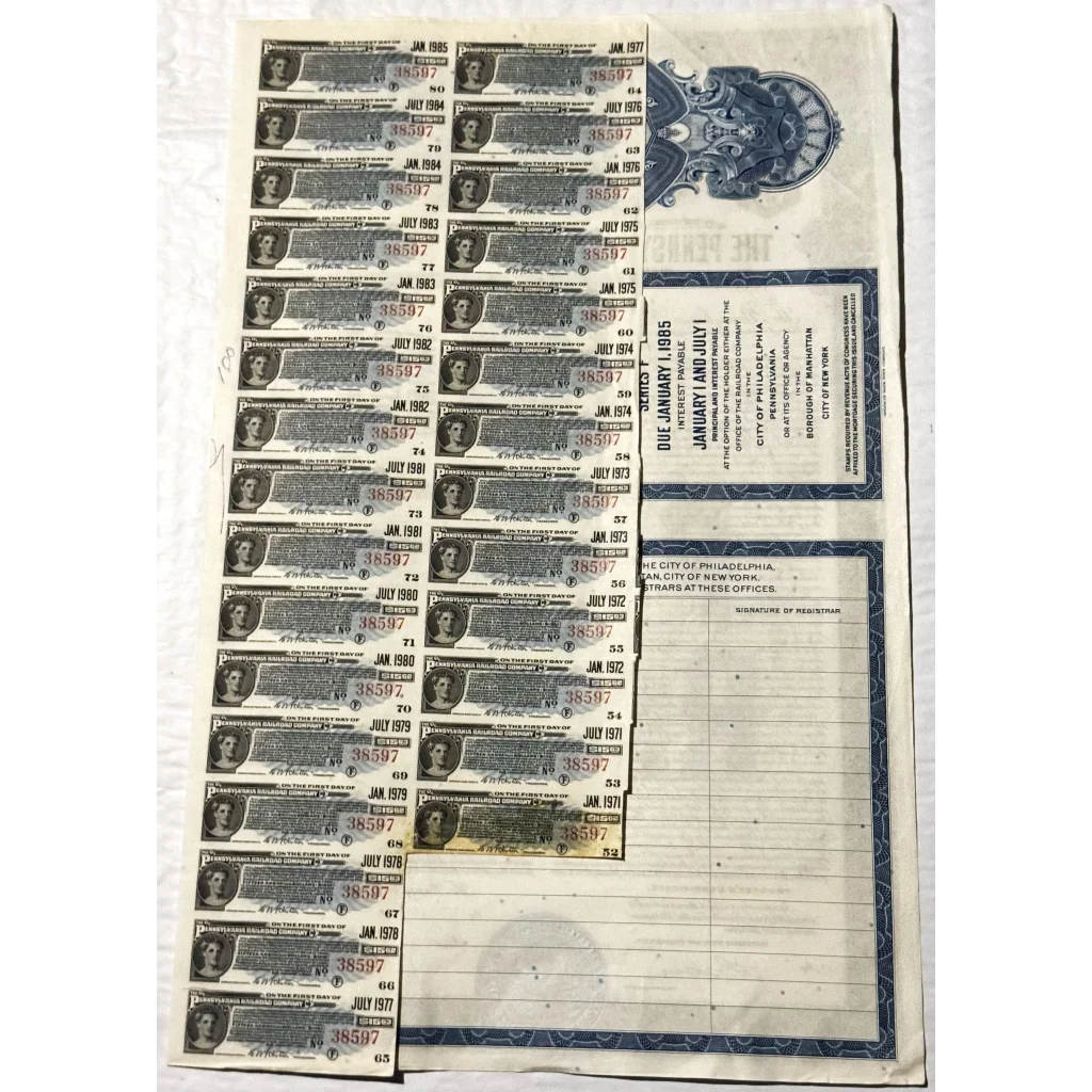This unique and rare Pennsylvania Railroad Pennsy Gold Bond is a true collector's gem! Famously known through the Monopoly game, owning this piece of history is an absolute privilege. While similar items are occasionally found, this particular certificate stands out with its intact coupons – a feature that makes it truly exceptional. It's not just a certificate; it's a tangible piece of an American Icon that has shaped the course of railroad history!