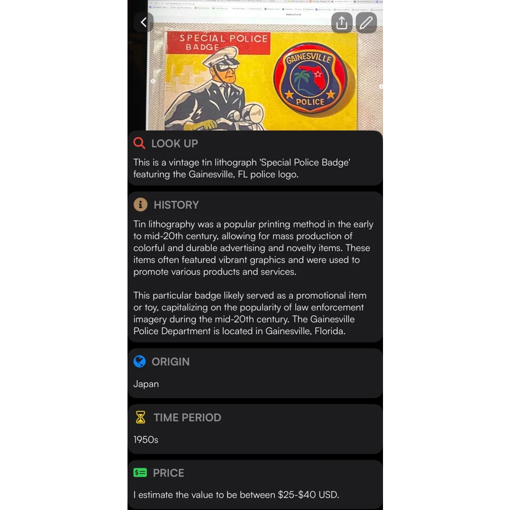 Don't let this extraordinary piece of history slip through your fingers! Own a slice of vintage Americana with this 1950s Vintage Tin Litho Special Police Badge from Gainesville, FL. Whether you're a seasoned collector of law enforcement memorabilia, a history buff, or simply someone who appreciates the artistry of bygone eras, this special police badge is sure to become the crown jewel of your collection. Act fast – history this rare doesn't come around often!
