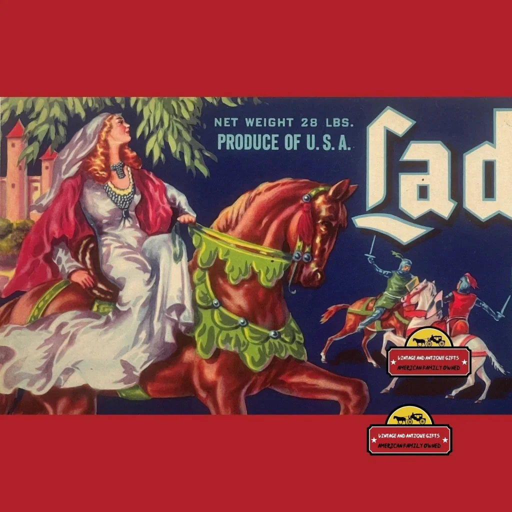 Prepare to be transported through time with this extraordinary piece of Americana! This antique vintage Lady Rowena Crate Label is not just a collectible; it's a portal to the enchanting 1950s, where chivalry and romance reigned supreme. Hailing from the sun-kissed orchards of Ivanhoe, California, this rare gem depicts a thrilling knight's duel scene that will set your imagination ablaze!