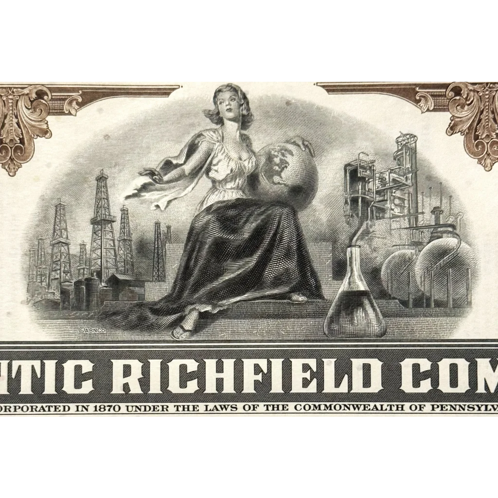 Dive into the exciting world of ARCO, born in 1966 when Atlantic Petroleum and Richfield Oil Corporation joined forces to create the Atlantic Richfield Company. This isn't just any old stock certificate - it's one of the earliest issued after this groundbreaking merger, making it a rare gem for collectors and history buffs alike!