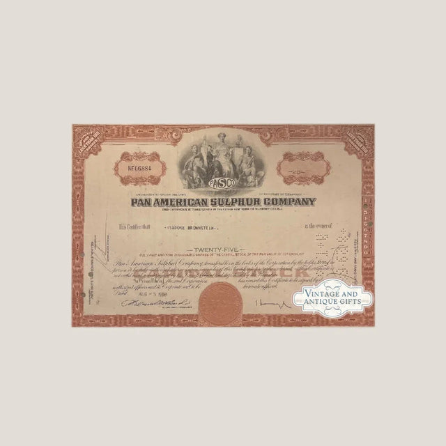 Unearth a piece of financial history with this extraordinary Vintage Pan American Sulphur Company Stock Certificate from Delaware, dating back to the thrilling 1960s! This captivating collectible, measuring an impressive 12" x 8", is more than just a document – it's a tangible connection to America's industrial past. Immerse yourself in the excitement of the sulphur boom era with this authentic piece of Pan American Sulphur memorabilia, showcasing the company's pivotal role in shaping the industry.