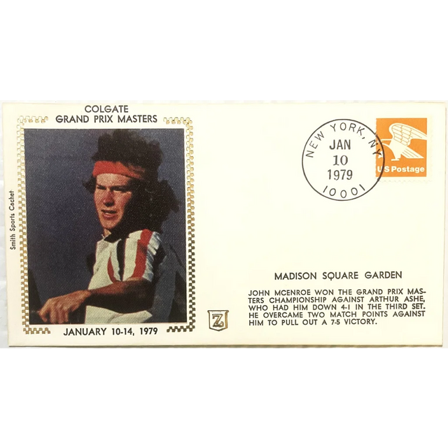 Meticulously crafted with an eye for detail, this exquisite embossed stamped envelope showcases McEnroe's triumphant victory at the 1979 New York, NY Colgate Grand Prix Masters Match. Measuring a compact 6 1/2 x 3 3/4 inches, this elegant piece serves as the perfect canvas to immortalize McEnroe's remarkable achievement. The intricate embossing brings the moment to life, allowing you to feel the energy and excitement of that historic match with every touch.