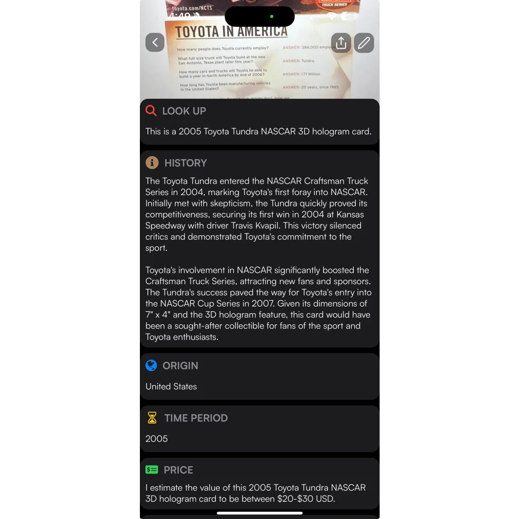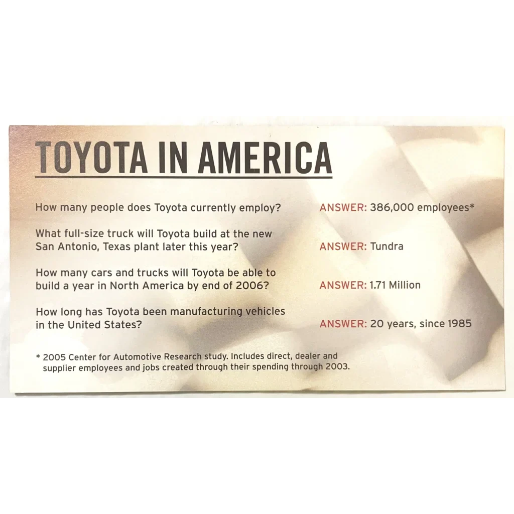 Buckle up, racing fans! This extraordinary 2005 NASCAR Winston Craftsman Truck Series Team Toyota Tundra 3D Hologram Card is not just a collectible - it's a portal to the heart-pounding excitement of the track! Measuring an impressive 7 x 4 inches, this holographic masterpiece brings the thunderous roar of NASCAR Winston racing to life right before your eyes. As you tilt the card, watch in awe as the Toyota Tundra seems to leap off the surface, its details so crisp and vivid you can almost smell the burning rubber!