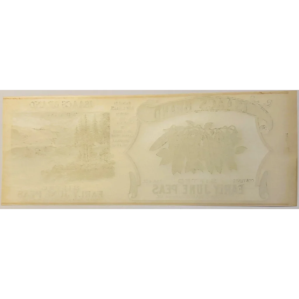 Step back in time with this incredible antique 1930s Isaacs Early June Peas Can Label! Crafted by the visionary John S. Isaacs out of Ellendale, Delaware, this piece of history is a true gem for collectors and history buffs alike.