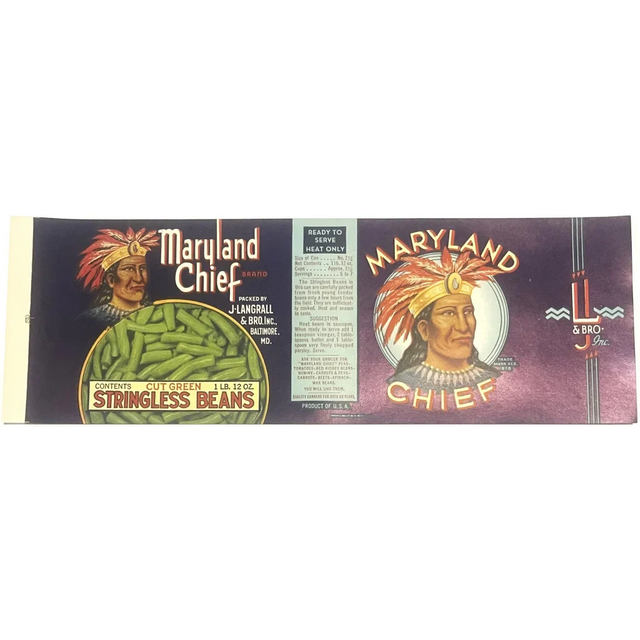 Transport yourself back to the vibrant 1920s era with this stunning Antique Vintage 1920s Large Maryland Chief Can Label from Baltimore, Maryland. Made by J Langrall & Bros Inc, this iconic label features the captivating image of a Native American Chief, exuding charm and history.