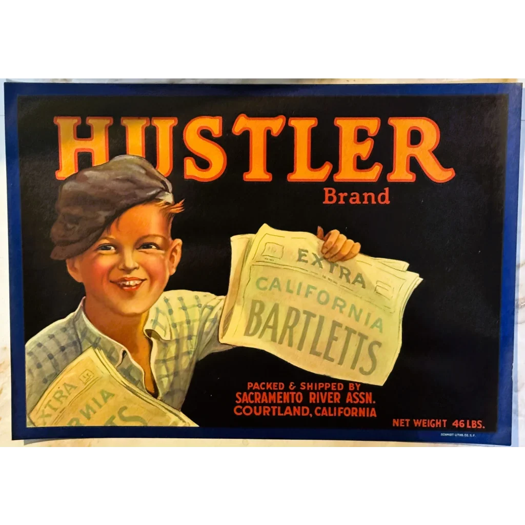 Step back in time with this incredible Vintage 1940s Hustler Crate Label, a true gem crafted by the Sacramento River Assn. in Courtland, California! This eye-catching piece of Americana measures a substantial 11" x 7 3/4" and shows little to minimal wear, preserving its vintage charm.