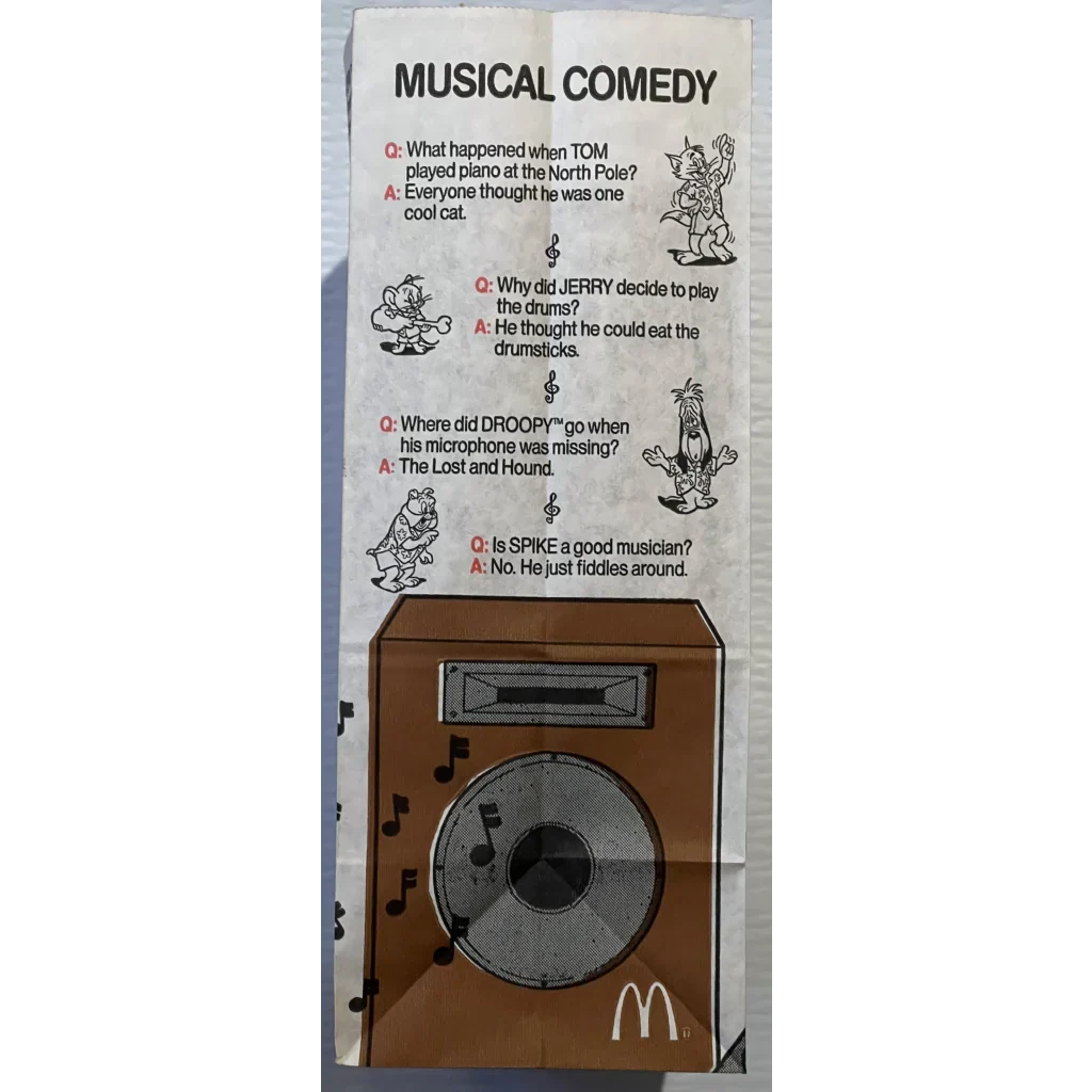 Step back in time and relive the electrifying 1980s with this Vintage Tom and Jerry McDonald's Happy Meal Bag! This stunning piece of American advertising history is not just a meal bag; it's a portal to a bygone era of Saturday morning cartoons and fast-food excitement. Featuring nostalgic designs of the mischievous Tom and Jerry, along with beloved characters Droopy and Spike, this Happy Meal bag will transport you back to the days of childhood wonder and anticipation.