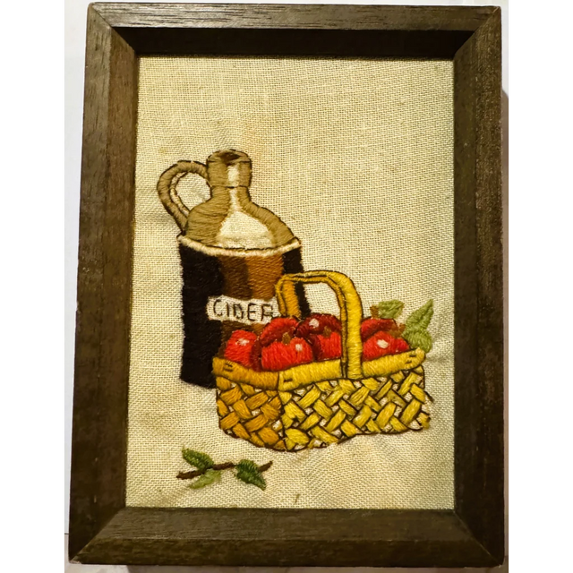 - Description: Get ready to feast your eyes on this breathtaking framed Sunset Designs crewel embroidery piece! It beautifully captures the essence of rustic Americana with its depiction of a cider jug and a bountiful basket of apples. The vibrant colors and intricate stitching bring this scene to life, making it a true conversation starter for any room.