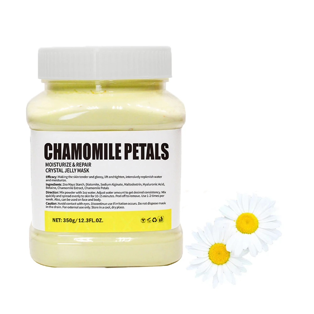 Almidón de Zea Mays, Diatomita, Alginato de Sodio, Maltodextrina, Ácido Hialurónico, Betaína, Extracto de Manzanilla, Pétalos de Manzanilla.