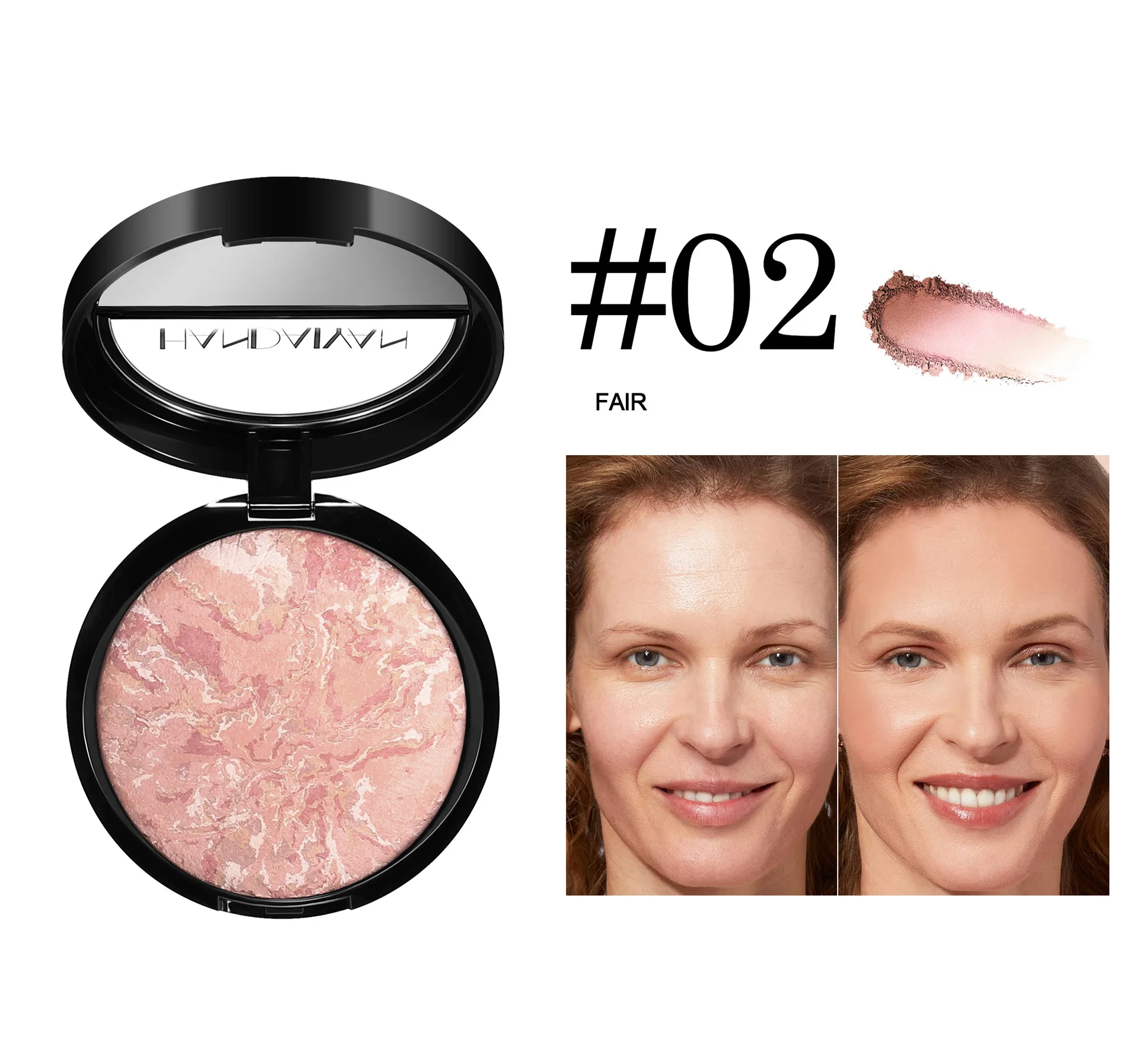 Como siempre, los pigmentos correctores de color en forma de remolino se hornean durante 24 horas en sartenes de terracota, libres de aceites minerales y parabenos, brillo natural con un acabado lujoso.