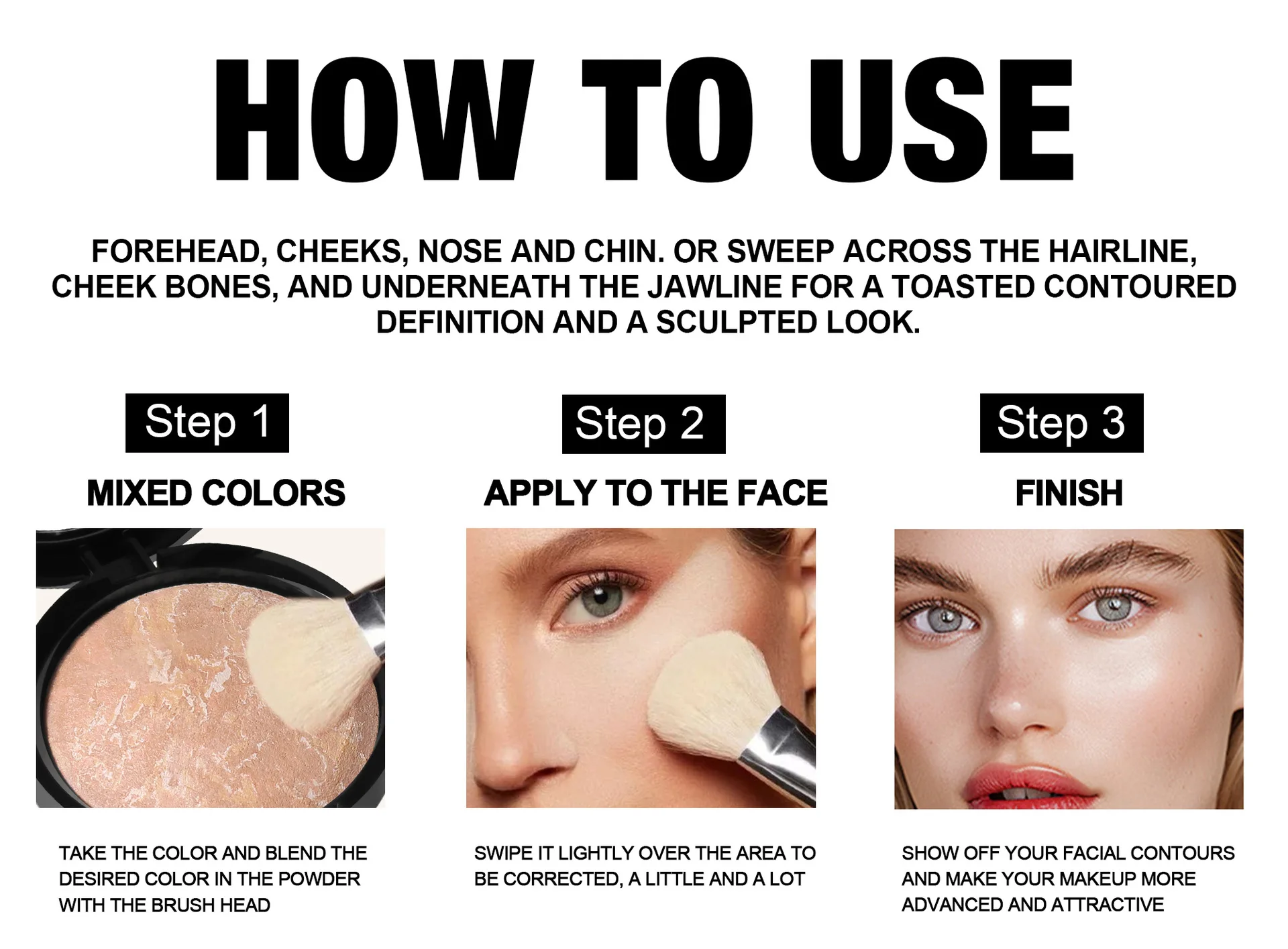 FRENTE, MEJILLAS, NARIZ Y MENTÓN. O BARRE A TRAVÉS DE LA LÍNEA DEL CABELLO, LOS PÓMULOS Y DEBAJO DE LA MANDÍBULA PARA UNA DEFINICIÓN CONTORNEADA Y TOSTADA Y UN ASPECTO ESCULPIDO.