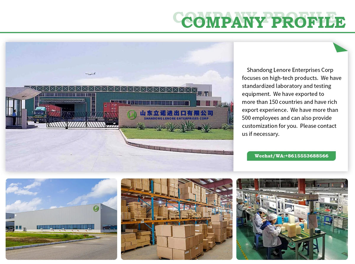 Shandong Lenore Enterprises Corp se especializa en productos de alta tecnología. Contamos con equipos de laboratorio y de prueba estandarizados. Hemos exportado a más de 150 países y contamos con una amplia experiencia en exportación. Contamos con más de 500 empleados y también podemos ofrecerle productos personalizados. Contáctenos si lo necesita.