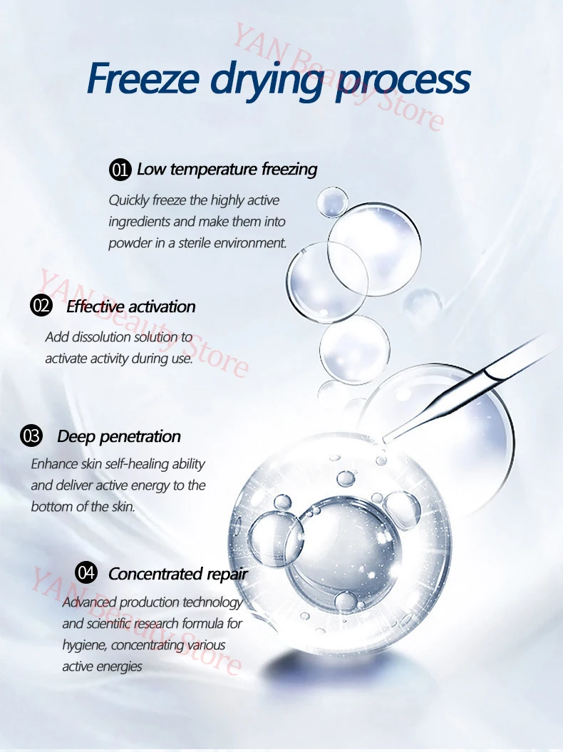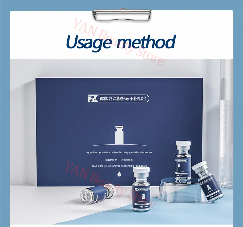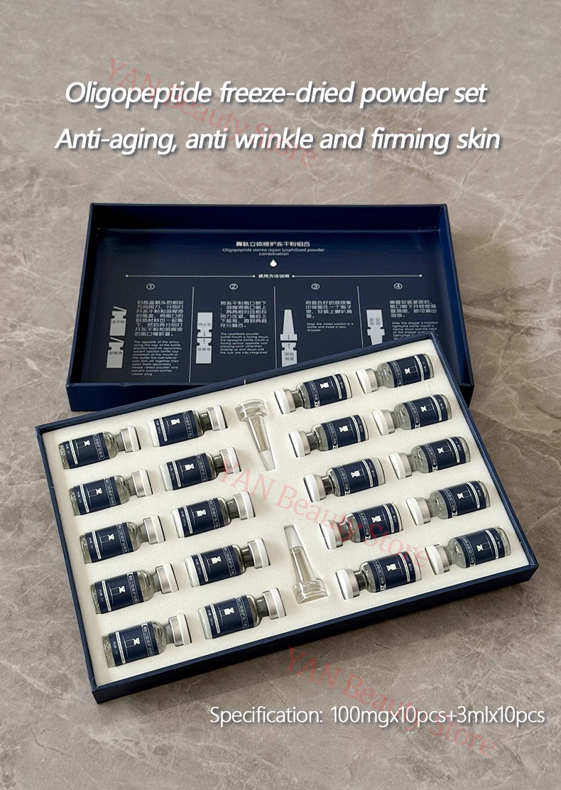 Set de oligopéptidos antiarrugas en polvo liofilizado, suero nutritivo, reparador de colágeno y reafirmante con ácido hialurónico para el cuidado de la piel.