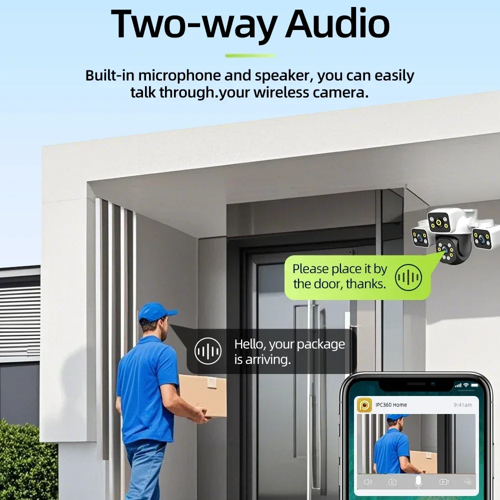 Cámara de seguridad panorámica 6K con triple lente: 3 pantallas, seguimiento por IA, audio bidireccional y visión nocturna a color.