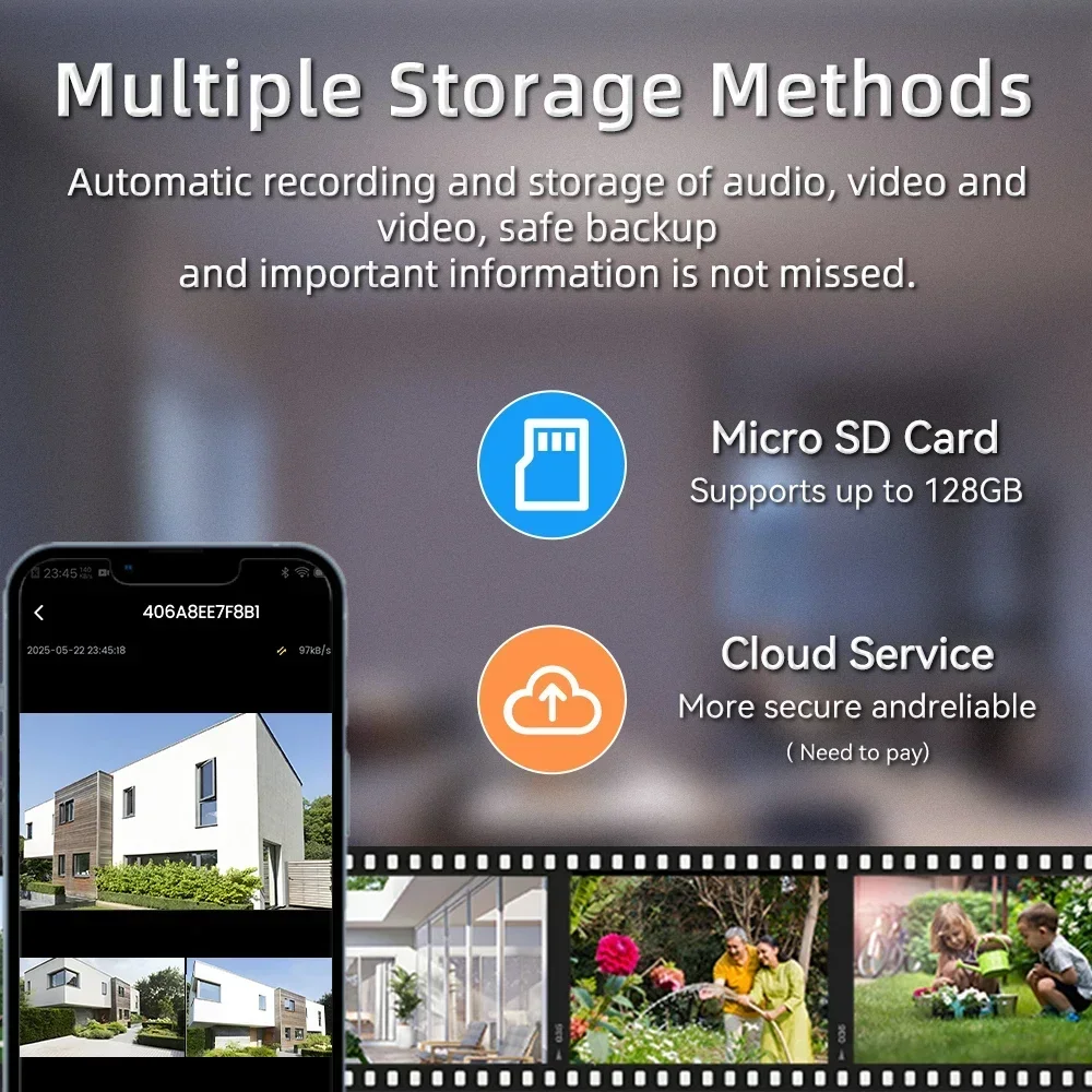 • Almacenamiento local (Tarjeta TF de 256 GB) + copia de seguridad en la nube opcional.