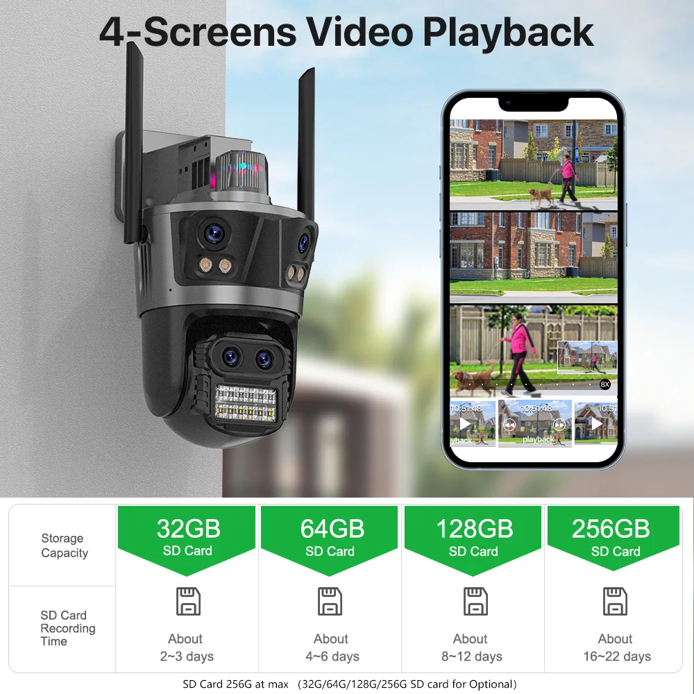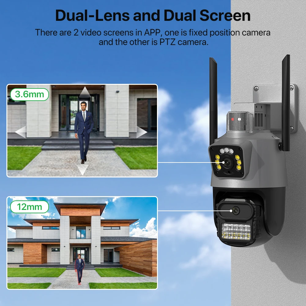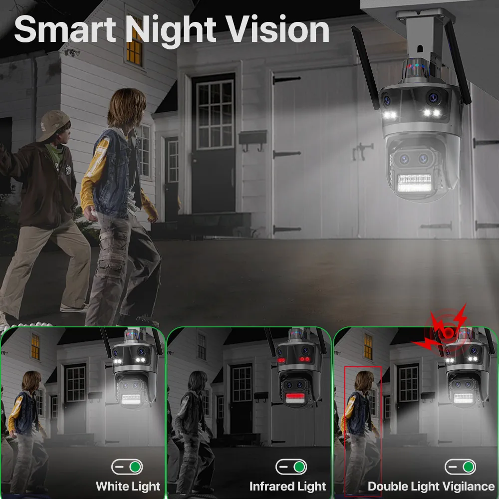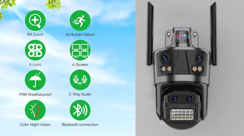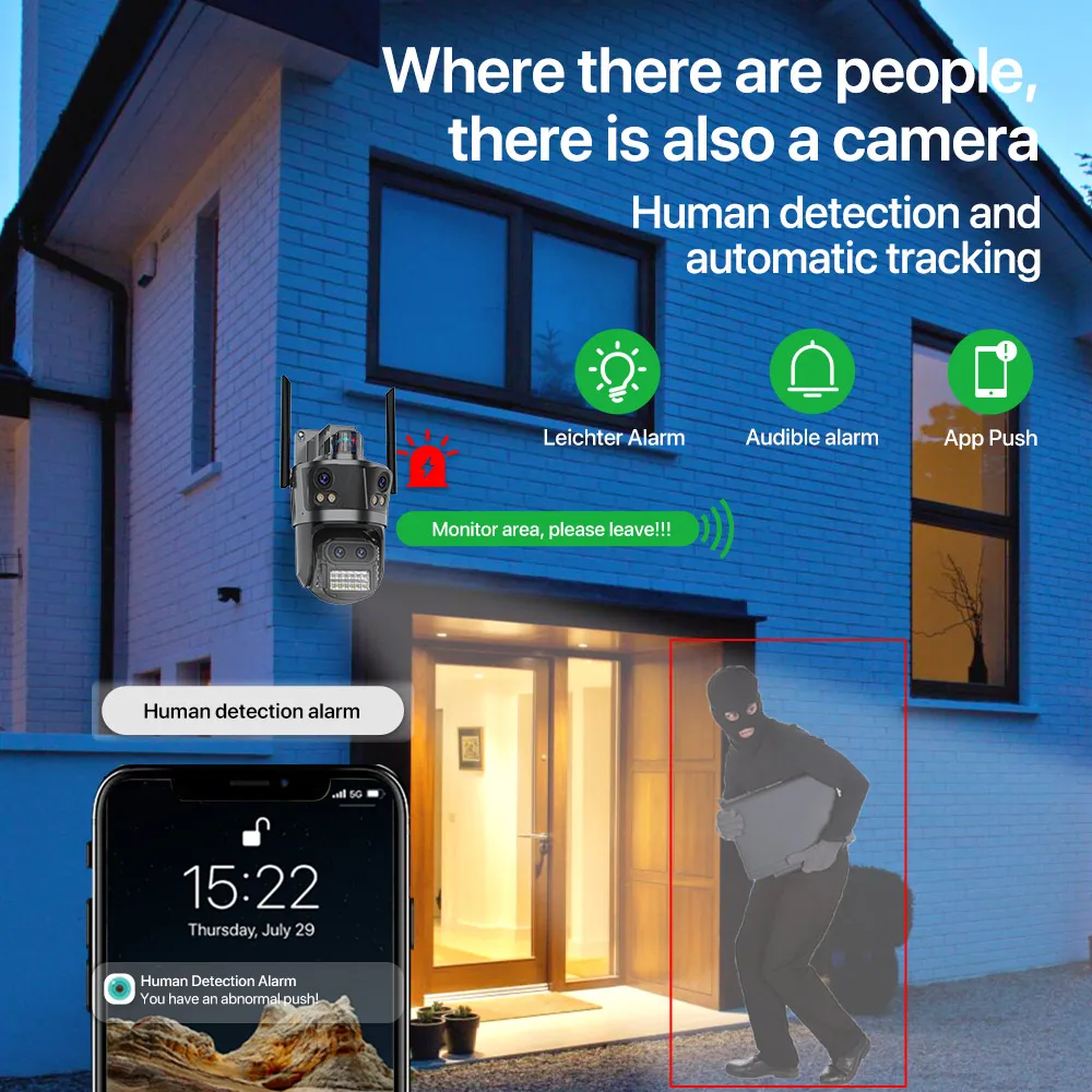 Cámara de vigilancia WiFi 8K con zoom 8X para exteriores, cuatro lentes, PTZ, IA, seguimiento humano, CCTV inalámbrica