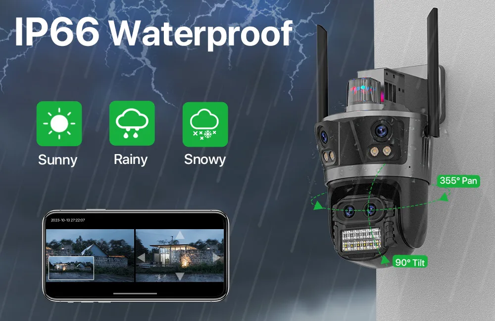 Esta cámara PTZ WiFi cuenta con un cuerpo y una carcasa resistentes y su clasificación de impermeabilidad IP66 la hace ideal para vigilancia en exteriores. Soporta condiciones climáticas adversas, como lluvia, nieve, frío y calor intensos.
