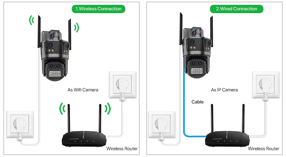 Alimentado por un adaptador DC 12 V, puede conectar la cámara a la red Wi-Fi. Puede configurar la conexión wifi de la cámara o la búsqueda LAN con un cable de red conectado al enrutador, funciona solo con wifi 2.4G (no es compatible con 5G).