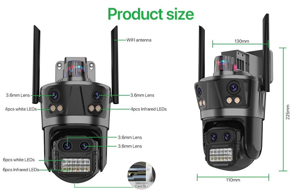 ●Diseño de fuente de luz dual, luz infrarroja incorporada + luz blanca, visión nocturna infrarroja y visión nocturna a todo color se pueden configurar;