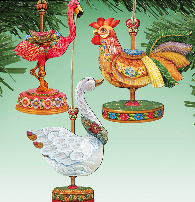 Adornos de madera de carrusel: gallo, ganso y flamenco, juego de 3, de G. DeBrekht - Decoración navideña - 8100088S3