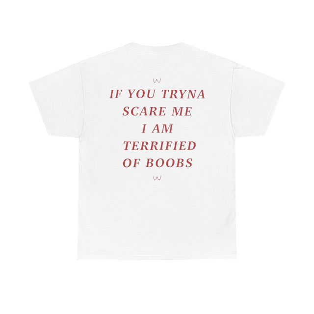 Turn heads, spark laughs, and own your humor with the If You Tryna Scare Me I Am Terrified Of Boobs Funny Shirt!