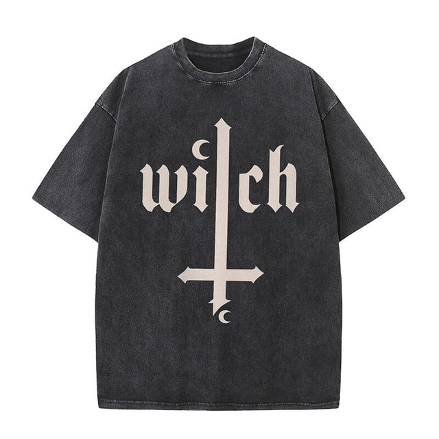 Get your celestial style on with the Witch Cross Moon Print Washed T-shirt. This trendy t-shirt features a unique Witch Cross design and a washed fabric for a vintage look. Perfect for casual days and fun nights, this t-shirt will make you stand out with its moon-inspired print.