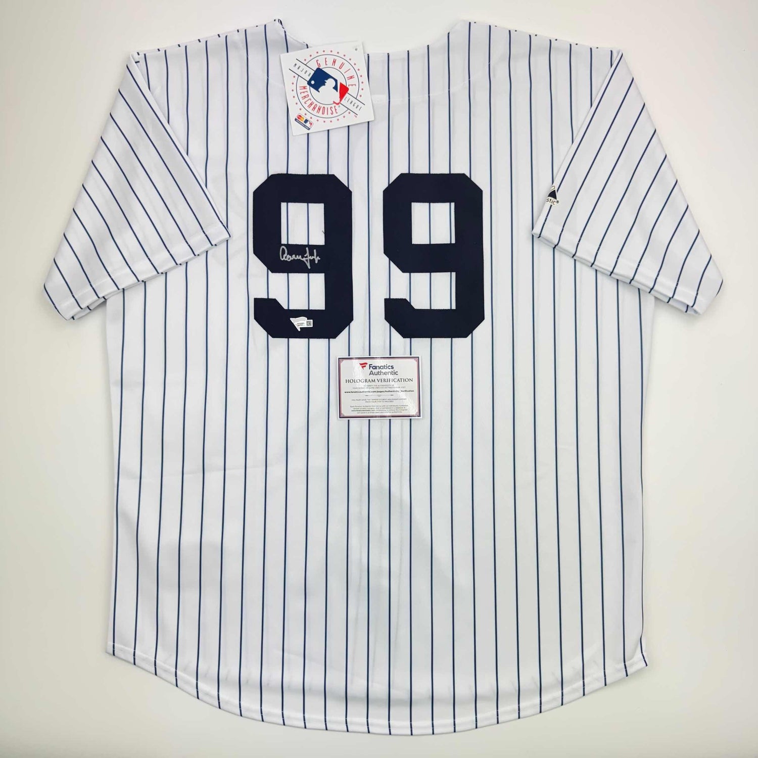 Autographed/Signed Aaron Judge New York Yankees Authentic Majestic Pinstripe Baseball Jersey Fanatics COA